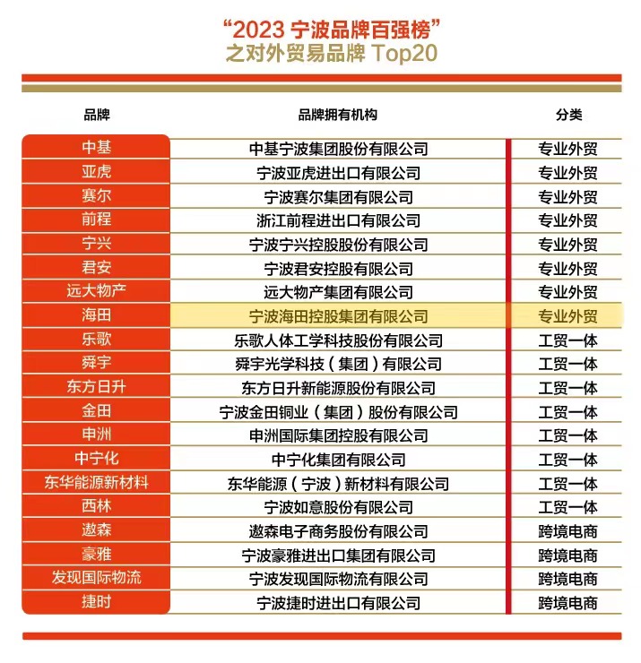 5月10日,“2023寧波品牌百強榜”正式發(fā)布,該榜單是由寧波市甬商發(fā)展研究會(huì )牽頭組織并聯(lián)合中國社科院品牌戰略研究課題組和中國市場(chǎng)學(xué)會(huì )、中國品牌研究中心等國內權威機構共同主辦指導,被業(yè)界稱(chēng)為寧波品牌界的“奧斯卡”獎,對寧波整體品牌形象的樹(shù)立起著(zhù)重要作用。在此次榜單中,寧波海田控股集團有限公司榮登“2023寧波品牌百強榜”之對外貿易品牌Top20。