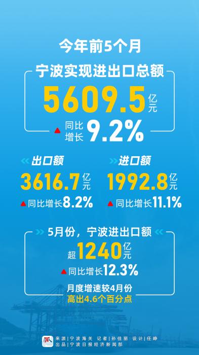 今年前5個(gè)月,寧波實(shí)現進(jìn)出口總額5609.5億元,同比增長(cháng)9.2%。其中,出口額3616.7億元,同比增長(cháng)8.2%;進(jìn)口額1992.8億元,同比增長(cháng)11.1%。